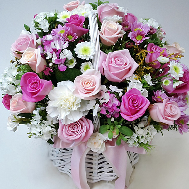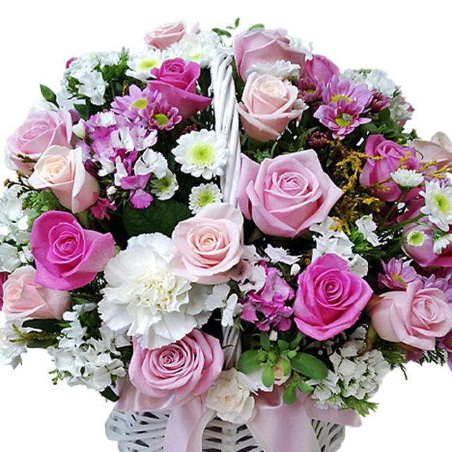 Romantic and sweet basket arrangement consisting of two shades of pink roses, white carnations, and small white flowers also mixed with green fillers