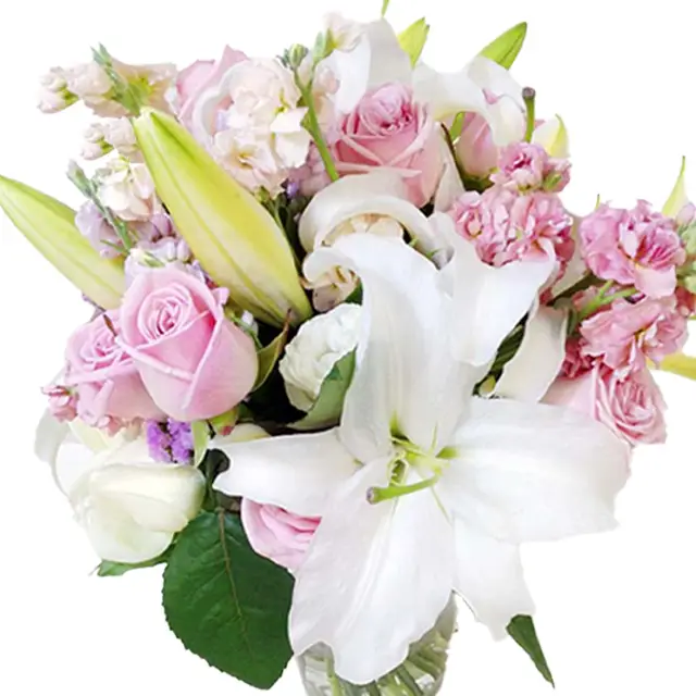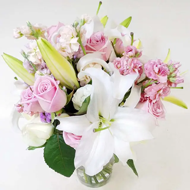 A table flower adrrangement in a clear vase consisting of pink roses, white lilies, and many other pink and white flowers
