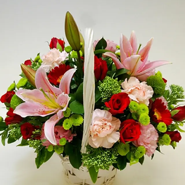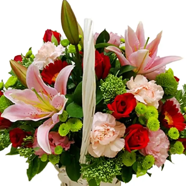 Suitable for all occasions, this basket arrangement it made of lilies, red roses, and carnations with green fillers