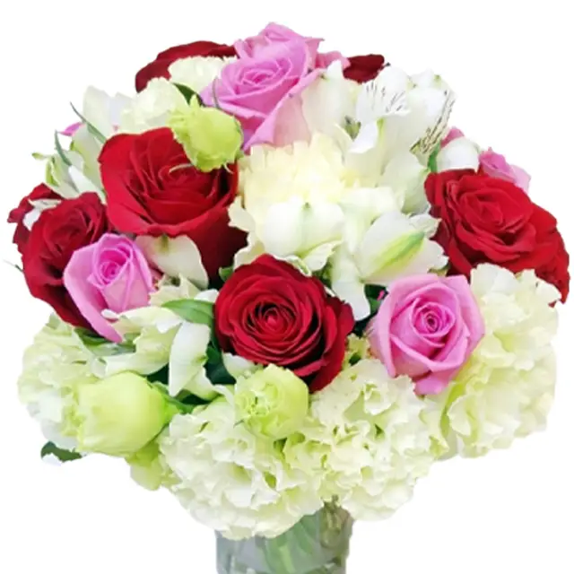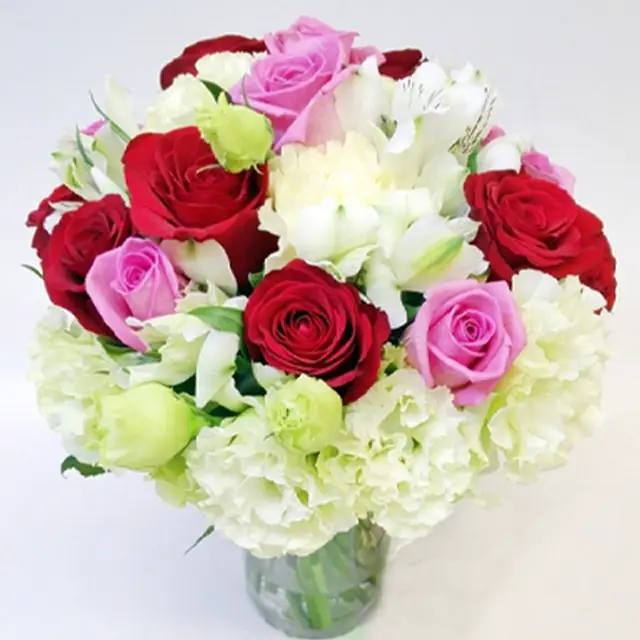 Red roses, white roses, white carnations, pink roses all arranged beautifully in a clear vase