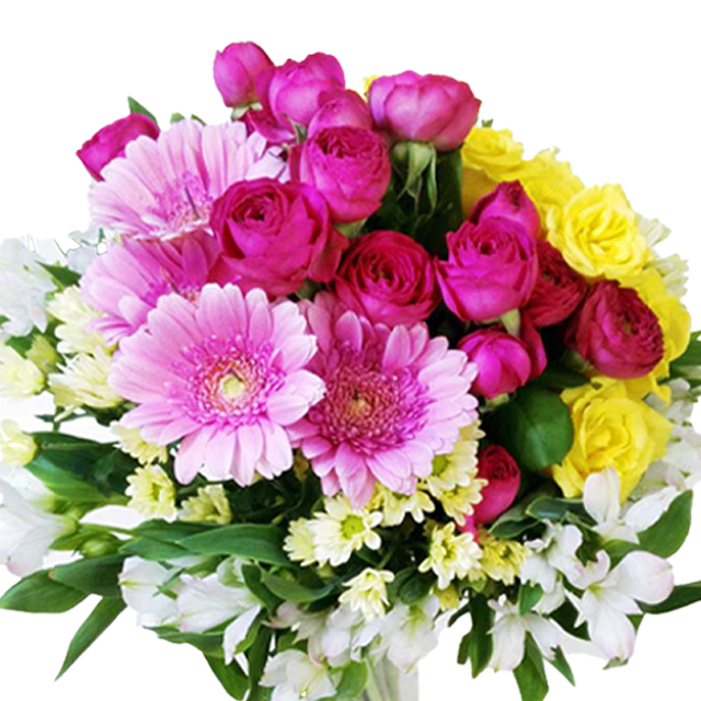 A mix of various colors like pink roses, yellow roses, pink gerberas, and small white flowers, arranged in a clear vase