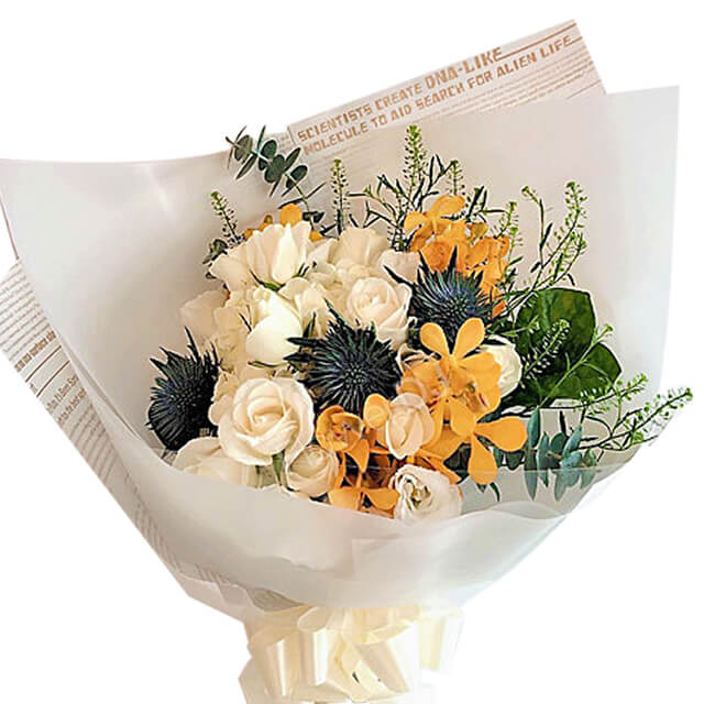 13 White Roses with Yellow Flowers, Hydrangea, 1 Thistle and also White Bellflower, Eucalyptus