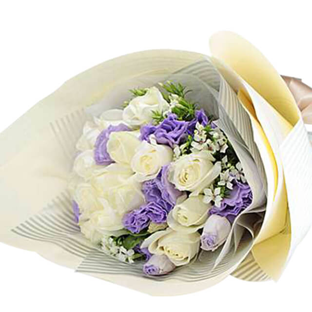 Bouquet of 16 White Roses with Purple Bellflower, Deep Mountain Cherry or White Flowers