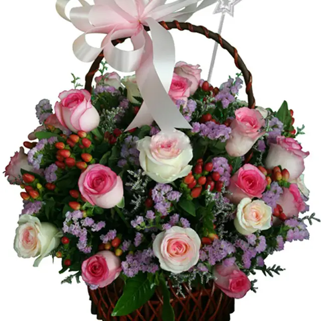 A basket of love filled with soft pink roses and purple fillers with greenies.