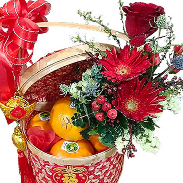 A festive gift basket of 8 oranges designed in a traditional Chinese style, featuring a red floral-patterned container. The basket is adorned with vibrant red ribbons, a decorative gold charm, and an arrangement of fresh flowers arranged and labeled, symbolizing prosperity and good fortune. The overall design emphasizes elegance and festive charm, ideal for celebratory occasions like Chinese New Year.