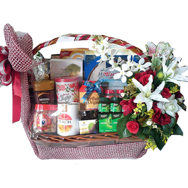 A thoughtfully curated basket featuring chicken soup, bird's nest, canned fruit, coffee, and a variety of tasty snacks, ideal for sharing joy and warmth.
