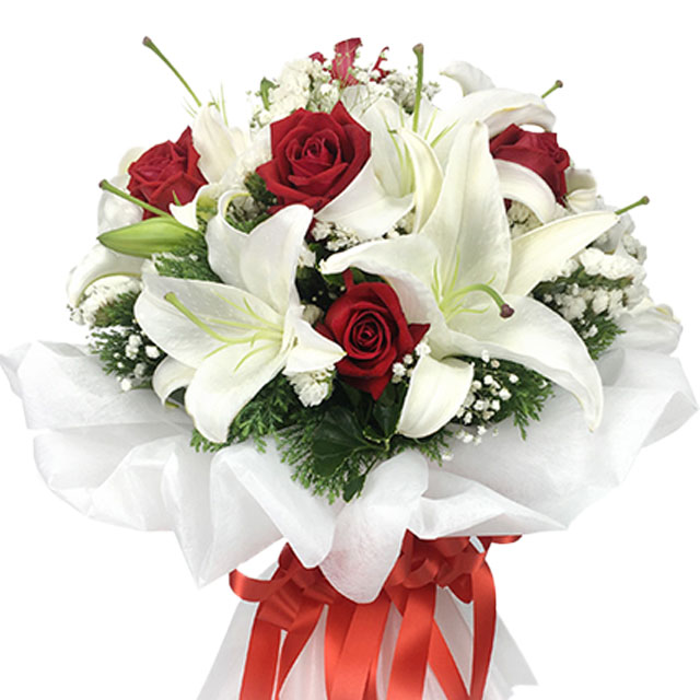 A mix of white lilies and red roses in a hand boquuet with green fillers.
