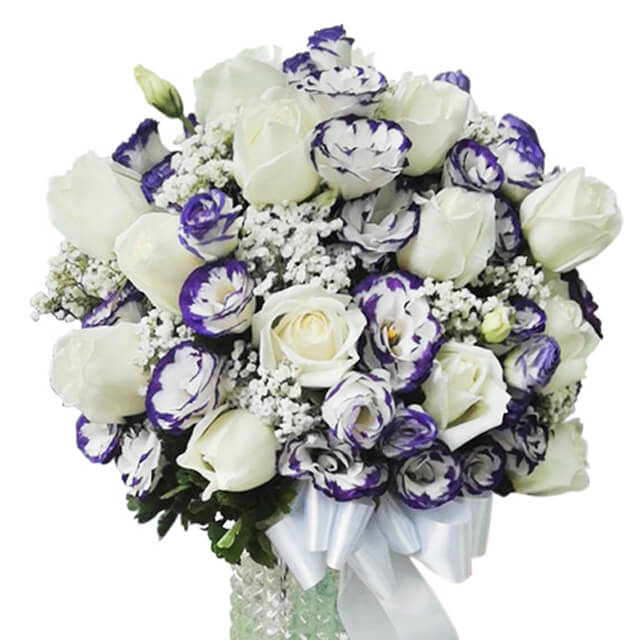 A beautiful white arrangement of white roses, baby breath, with white flowers with purple shade on the edges