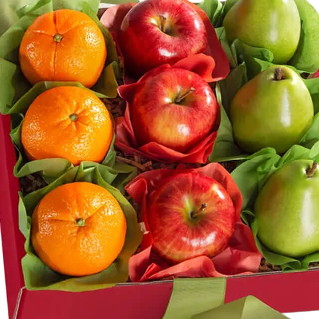 Celebrate the season's bounty with a charming gift basket featuring the crisp juiciness of green pears, the classic sweetness of red apples, and the vibrant tang of navel oranges, capturing the essence of winter's fruitful offerings. This thoughtfully arranged selection of fruits embodies the heartwarming spirit of the holidays, perfect for sharing moments of joy and indulgence with loved ones.