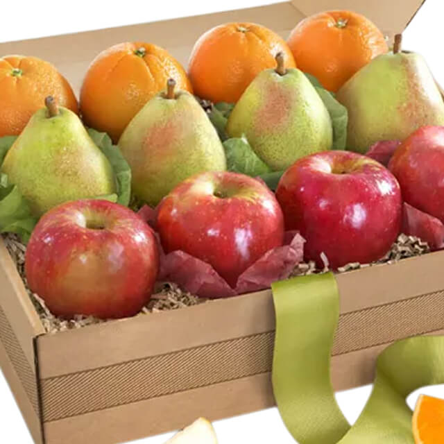 Elevate the holiday cheer with a stunning gift basket featuring the crisp freshness of green pears, the classic allure of red apples, and the tangy brightness of navel oranges, capturing the essence of the season's abundance. This thoughtfully curated assortment of fruits embodies the joy of the holidays, offering a delightful variety perfect for gifting or enjoying during cozy, festive moments with loved ones.