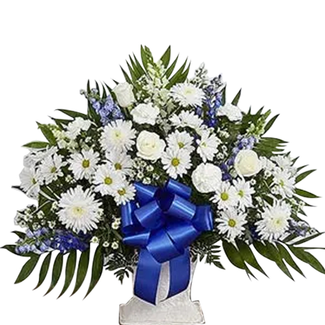 A memorable sympathy floor basket is a wonderful way to send your sympathy. Created with fresh flowers including white roses and snapdragons with blue delphinium. Delivered in a keepsake basket with a decorative ribbon. Arrangement measures approximately 32""H x 40""L.