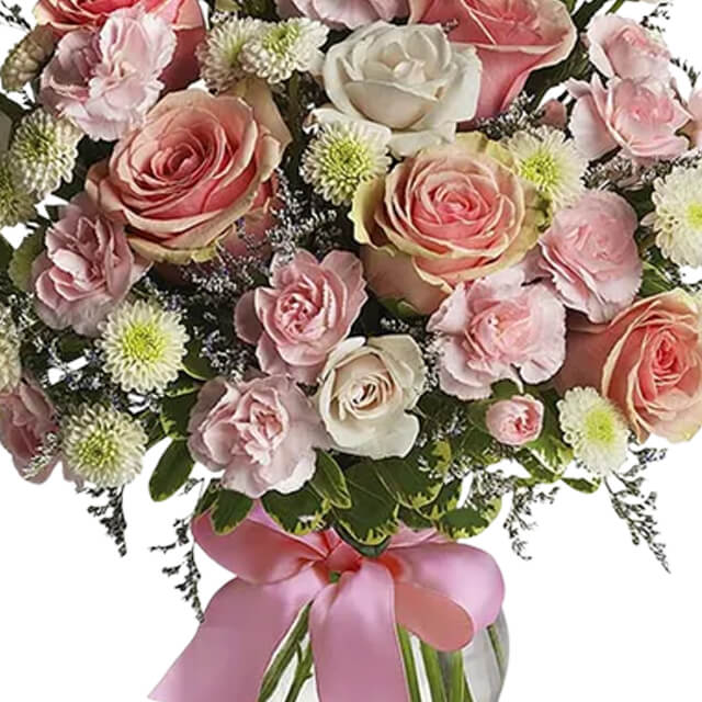 Fluffy pink roses mingle with pristine white blooms, creating a confectionery-inspired arrangement as delightful as spun sugar. Presented in a sparkling glass vase adorned with a blush ribbon, this dreamy composition brings instant joy to birthdays, bridal showers, or any moment that calls for a touch of sweetness.
