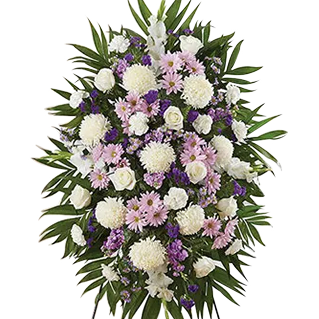Send a beautiful Lavender floral standing spray as a symbol of your heartfelt compassion. Hand arranged with seasonal flowers including roses, snapdragons and carnations in white and lavender colors with bursts of purple. Sympathy standing sprays are a wonderful gift to send to a family member or friend who recently lost a loved one.