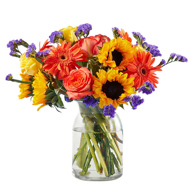 Go gently down the stream under sunflowers and warm roses with our Rowboat Blossoms Bouquet.