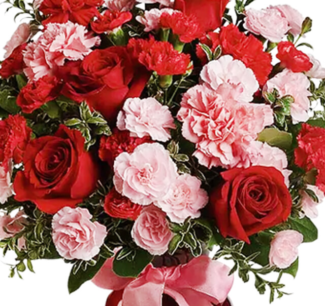Celebrate the day of love this year with a beautiful classic Valentine's Day floral bouquet. Arranged with red roses and pink carnations, this bouquet will make an impression on February 14th. Delivered in a keepsake red vase with a decorative pink bow, she will love that you thought of her this Valentine's.