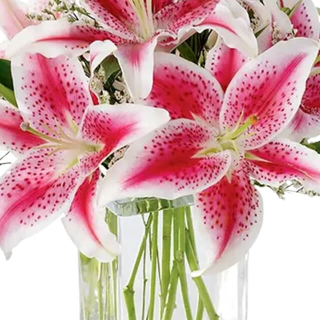 Dramatic pink Stargazer lilies command attention, their bold blooms contrasted by ethereal white limonium in a sleek rectangular vase—a striking modern tribute to deep devotion. Perfect for anniversaries, romantic surprises, or moments when only the most breathtaking floral statement will do.