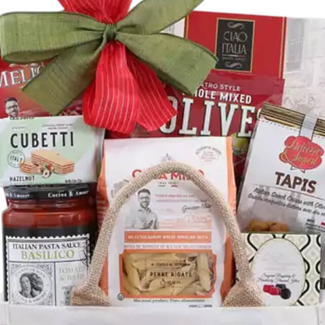 This gift is filled with traditional Italian gourmet food including Dolcetto hazelnut wafers, penne pasta, Italian crisps, Le Preziose sugared fruit jellies, sesame and cranberry cookies, bruschette bites, tomato basil garlic sauce and Bella Campagna whole mixed olives, all beautifully packed in a burlap bag, perfect for preparing this Italian meal.