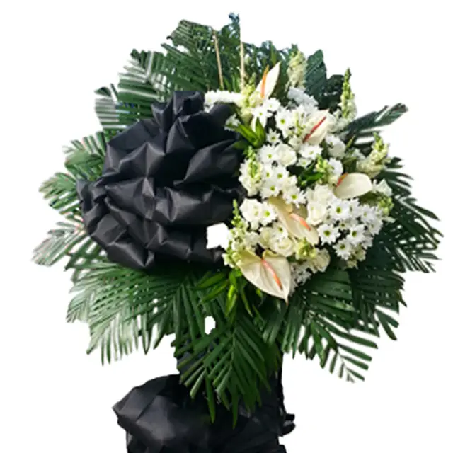 A unique condolence stand that uconsists of white flowers on one side, and black cloth material on the other