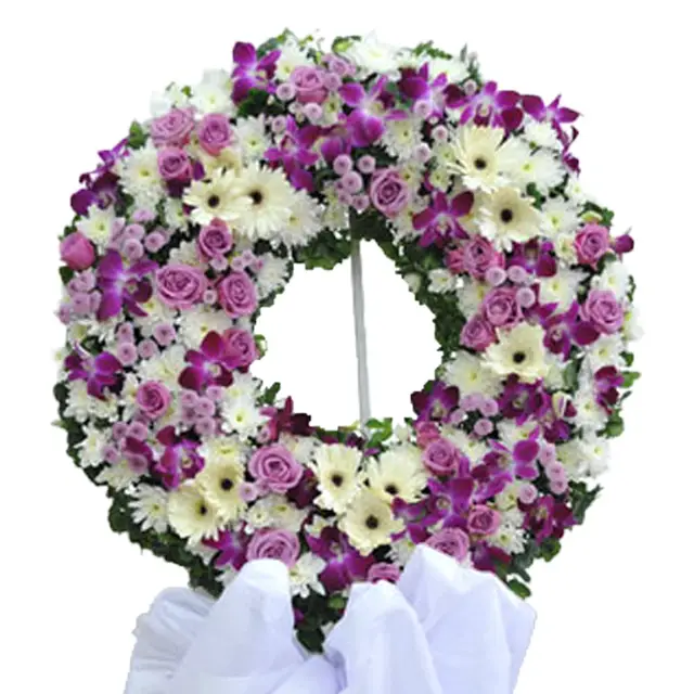 Condolence wreath with combination of white gerberas, purple roses, purple orchids to create this sweet mix of purple and white flowers.