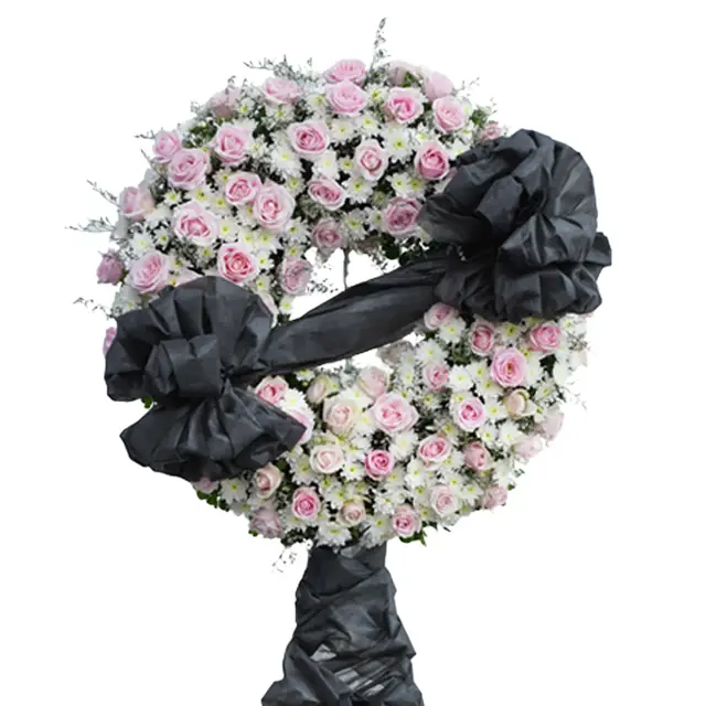 This Wreath is made up of Pink Roses and White Gerberas, also filled with Baby Breath, completed with a Black Ribbon across the wreath